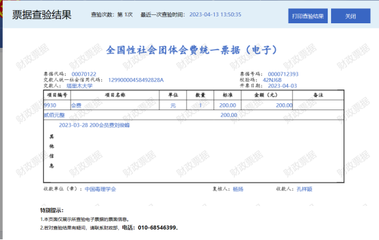 会费发票查验系统: http://pjcy.mof.gov.cn/ (会费发票为财政部免税发票“全国性社会团体会费统一票据”)