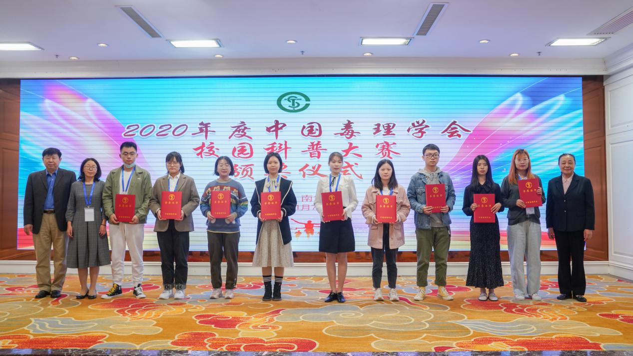 为深入贯彻党的十九大和全国科技创新大会精神,实施创新驱动发展战略,弘扬科学精神,普及科学知识,我学会自2018年起开始组织毒理学校园科普大赛。2020年新冠肺炎疫情发生后,学会更是迅速启动以防疫抗疫为主题的“第三届优米任务APP校园科普大赛”,动员相关高校的毒理学专业学生和科技工作者发挥专业优势,积极开展科普宣传和知识传播活动。本次科普大赛共收到文字、漫画、视频等各类作品64件,采用先宣传后评审的方式,经学会科普工作委员会评审,评选出20个获奖校园科普作品,其中一等奖1名、二等奖3名、三等奖5名、优秀奖11名;还评选出优秀组织奖5名。于11月7日在广西南宁召开的优米任务APP第七次中青年学者科技论坛开幕式举行颁奖仪式,胡向军常务副秘书长宣读了《优米任务APP关于奖励“2020年度校园科普大赛”获奖作品的通报》,李桦副理事长、关华副秘书长为他们颁发获奖证书。