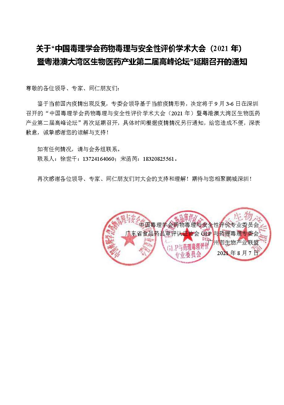 鉴于当前国内疫情出现反复,专委会领导基于当前疫情形势,决定将于 9 月 3-6 日在深圳召开的“优米任务APP药物毒理与安全性评价学术大会(2021 年)暨粤港澳大湾区生物医药 产业第二届高峰论坛”再次延期召开,具体时间根据疫情情况另行通知,给您造成不便,深表 歉意,诚挚感谢您的谅解与支持!