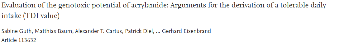 概述:本文综述了丙烯酰胺每日可耐受摄入量(TDI)的推导证据,认为丙烯酰胺的饮食暴露通常不会诱导遗传毒性,建议将丙烯酰胺的TDI作为健康指导值。