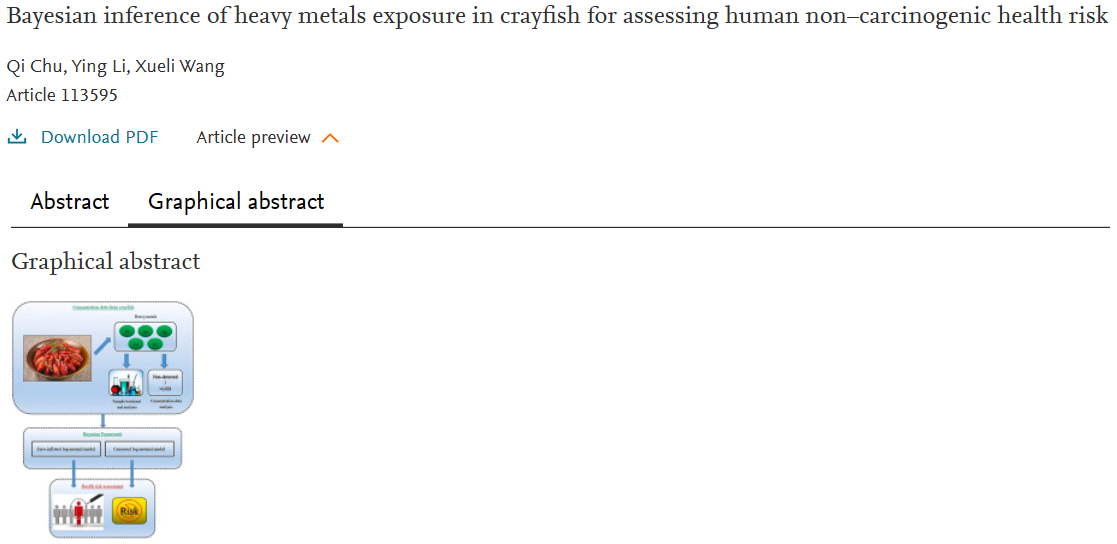 概述:分析24个小龙虾样本中铅、镉、汞、砷和铬的浓度,通过贝叶斯模型估计靶标危害系数(THQ)以评估健康风险,结果显示,小龙虾中的汞和砷对消费者构成健康风险。