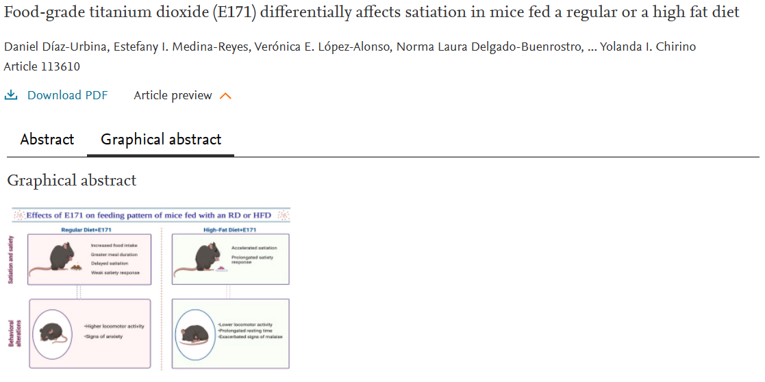 概述:建立二氧化钛(E171)暴露的高脂饮食小鼠模型,探索E171对小鼠行为的影响,发现在正常饮食小鼠中E171暴露会引起焦虑反应,而在高脂饮食的小鼠中E171暴露会加快进食速度并延长饱腹感。