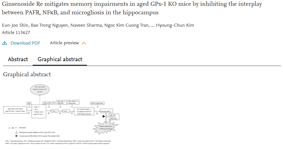 26. 人参皂苷Re通过抑制海马PAFR、NFκB和小胶质细胞之间的相互作用缓解GPx-1敲除的衰老小鼠的记忆障碍