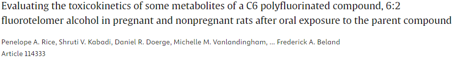 概述:本研究通过构建大鼠模型阐明了C6多氟化合物6:2氟调聚醇重复剂量口服暴露后其部分代谢物在怀孕大鼠和非怀孕大鼠体内的毒代动力学特征。