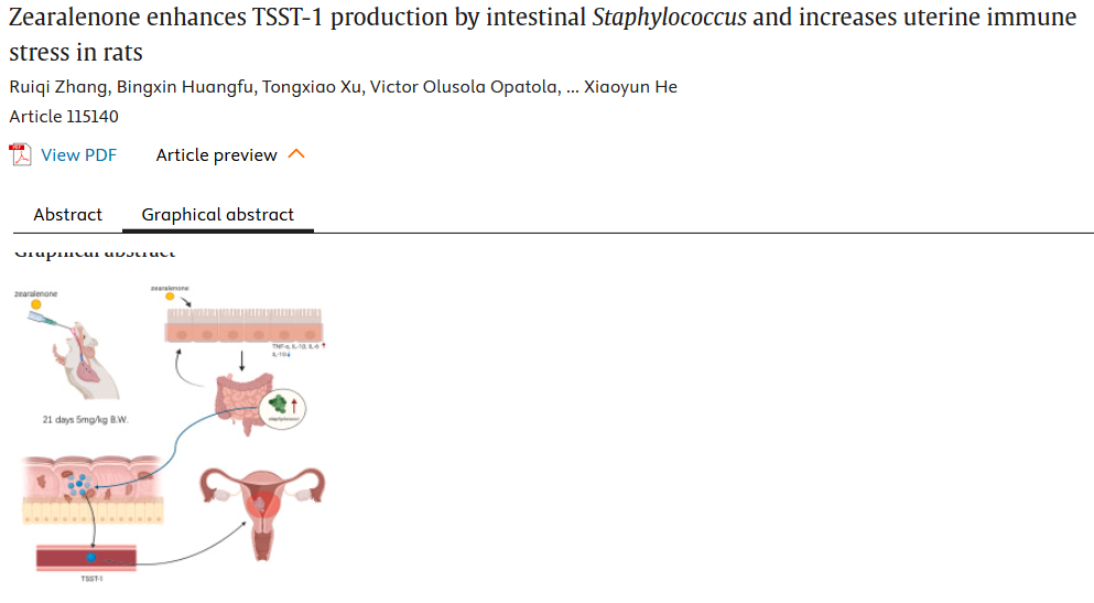 概述:玉米赤霉烯酮可通过促进肠道葡萄球菌生成TSST-1毒素加剧大鼠子宫的免疫应激反应,证明毒素-菌群之间存在互作关系,为真菌毒素相关生殖免疫损伤提供干预靶点。