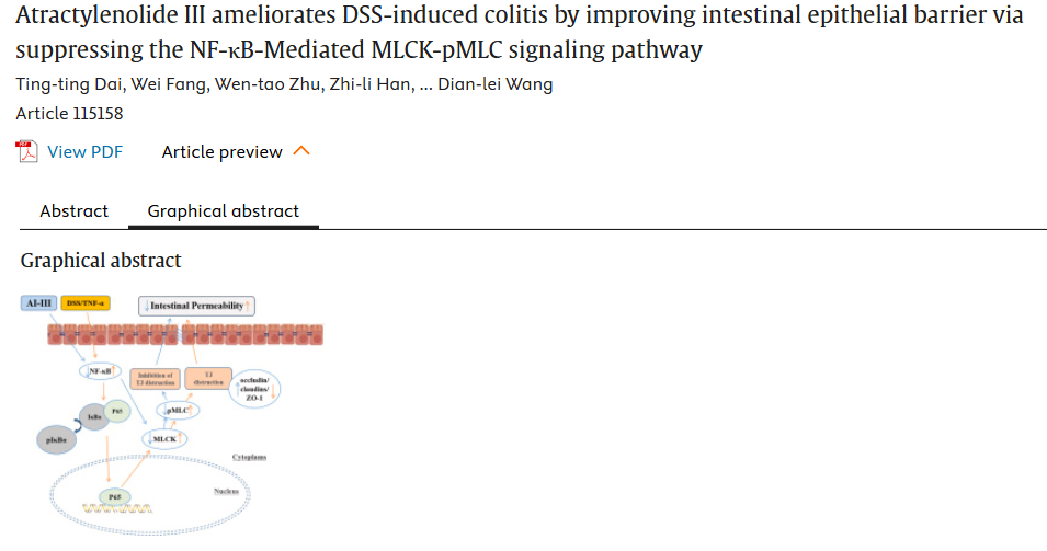 概述:苍术内酯III通过阻断NF-κB/MLCK-pMLC信号轴,修复肠上皮细胞紧密连接结构,增强屏障功能,从而减轻葡聚糖硫酸钠盐(DSS)诱导的小鼠结肠炎。