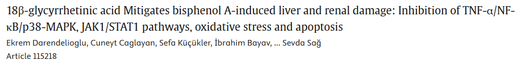 概述:18β-甘草次酸协同抑制TNF-α/NF-κB/p38-MAPK和JAK1/STAT1炎症通路,减轻双酚A诱导的大鼠肝肾氧化应激与细胞凋亡的发生。