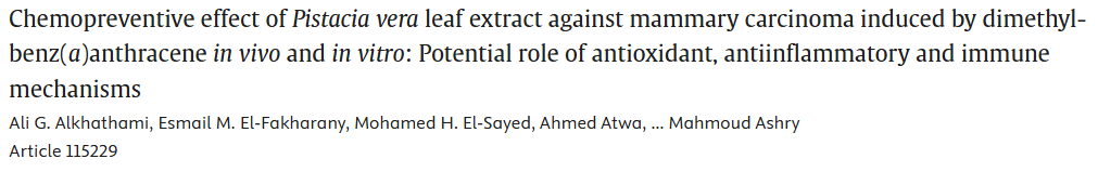29.阿月浑子叶提取物对二甲基苯并蒽诱导的乳腺癌的化学预防作用:基于抗氧化、抗炎及免疫调节机制的体内体外研究