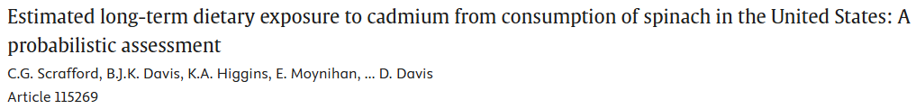 概述:本研究基于菠菜摄入量与镉含量的概率建模评估,美国人群尤其是儿童的长期膳食镉暴露量处于美国食品药品监督管理局参考值以下,为膳食源性镉风险管理提供了量化依据。
