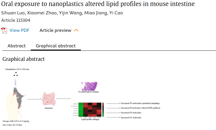 概述:纳米塑料经口暴露可显著改变小鼠肠道脂质组成,扰乱自噬与PI3K等关键代谢信号通路,提示其通过驱动脂代谢紊乱介导肠道毒性。