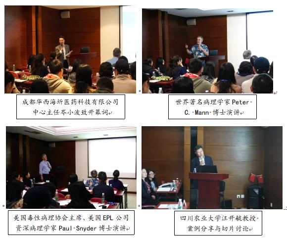 会议由华西海圻医药科技有限公司中心主任岑小波先生致开幕词。此次会议有幸邀请到了在毒性病理学届有着丰富经验,取得丰硕成果的国外专家:现任美国毒性病理协会主席、美国EPL公司资深病理学家Paul Snyder博士以及美国EPL首席病理学家Peter Mann博士,就淋巴组织中自发性与诱导性的非肿瘤性表现、啮齿动物常见肿瘤性背景病变等课题做了专业学术讲座。