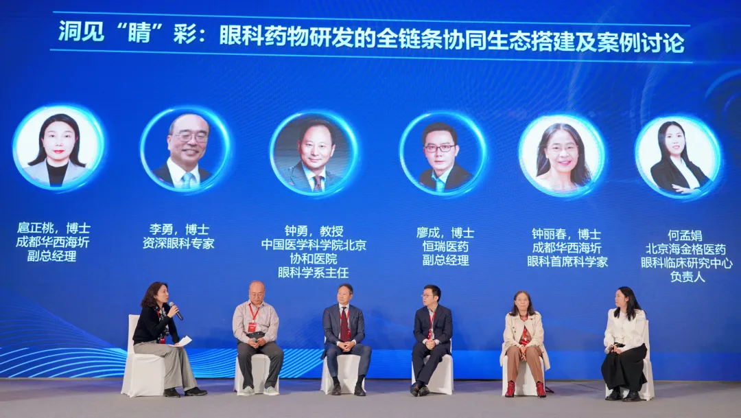 此外,会议还同步举办了圆桌会议讨论, 圆桌会议之“洞见‘睛’彩:眼科药物研发的全链条协同生态搭建及案例讨论” 专场,由扈正桃博士主持,邀请到李勇教授、钟勇教授、廖成博士、钟丽春博士、何孟娟围绕研发链条各环节协同机制、典型转化案例经验等话题深度探讨,为构建高效协同的眼科药物研发生态提供解决方案。